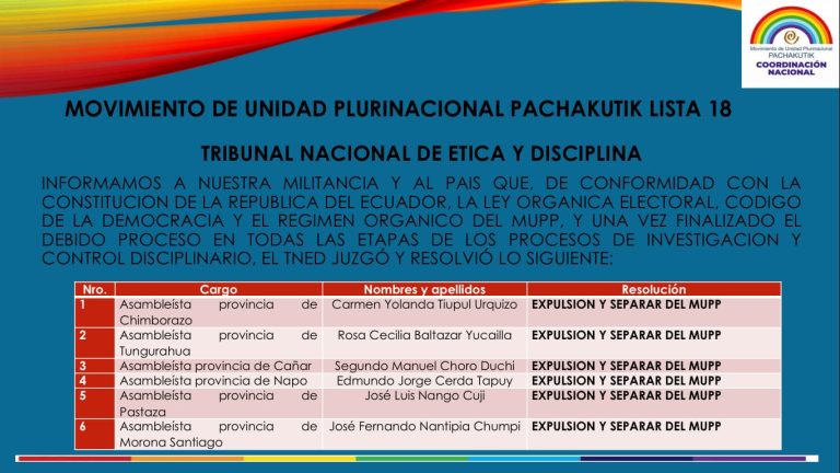 El Movimiento de Unidad Plurinacional Pachakutik (MUPP-18) es un movimiento político ecuatoriano de izquierda, plurinacional e intercultural, que se creó como iniciativa de la CONAIE y los movimientos sociales, el 1 de noviembre de 1995, como una expresión de la lucha y la resistencia social contra el neoliberalismo y el capitalismo depredador; y que aglutina a todos los sectores democráticos del país y a los diferentes movimientos sociales por un país justo, equitativo, soberano, libre de violencia machista y patriarcal, libre de violencia extractiva, libre de explotación capitalista; y en donde todos los habitantes gocen del derecho a la vida digna, en condiciones de interculturalidad y en reconocimiento a las diferencias radicales que constituyen y conforman a la nación e integrado al mundo bajo el principio del respeto a la autodeterminación de los pueblos